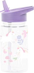 Priehľadná detská fľaša na pitie s potlačou jednorožcov medzi dúhou. Fľaša je nepriepustná a ideálna na výlety alebo do škôlky.