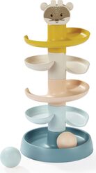 Veža na zostavenie pre najmenších v jemných farbách s loptičkami a hlavou medvedíka na vrchole.