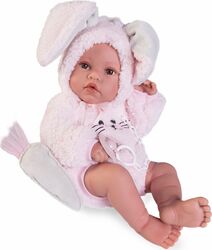Ručne vyrobená realistická španielska bábika - bábätko new born s celovinylovým telom a realistickým vyobrazením rôznych bábätkovských faldíkov a detailov vrátane pohlavia.Bábika je vyrobená zo špeciálneho mäkčeného vinylu, veľmi príjemného na dotyk. Bábätko sa dá kúpať, ale je potrebné dať pozor, aby sa nenamočili riasy. Odlepené riasy nie sú potom dôvodom na reklamáciu. Oblečenie niektorých bábik bolo vyrobené z organickej bavlny, ktorá zaručuje výrobu z ručne zbieranej, ekologicky bez chemického ošetrenia pestovanej bavlny. Firma Antonio Juan kladie veľký dôraz na ekológiu a preto ako prvá využíva v tomto odvetví spomínanú bavlnu.