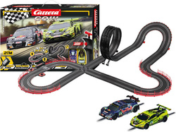 Autodráha Carrera GO!!! dlhá 6,3 m s vozidlami radu GT3 Audi R8 LMS a Lamborghini Huracán obsahuje križovatku, rovinky, zákruty, klopenú zákrutu, looping, počítadlo kôl a ďalšie časti. Môžete si postaviť ďalšie rôzne trate podľa svojej fantázie.