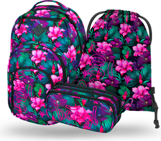 BAAGL 3 SET Coolmate Paradise je školský set, ktorý každé dievčatko zamiluje na prvý pohľad! Tento zvýhodnený set obsahuje pestrofarebný batoh Coolmate, štýlový peračník etue a praktické vrecko na obuv, všetko s motívom tropických kvetov a logom BAAGL.