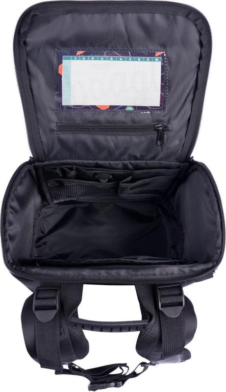 • Vnútri aktovky je priehľadná kapsa s rozvrhom a vnútorný organizér umožňujúci rovnomerné rozloženie hmotnosti doplnený gumičkou kvôli fixácii.