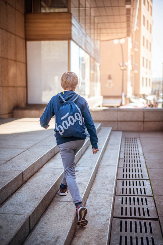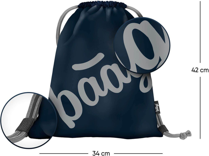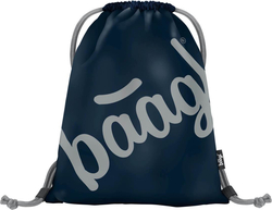 Vrecko na obuv v tmavomodrej farbe s logom Baagl, ktoré v tme svieti, zaťahovanie pomocou pevných šnúrok, ktoré zároveň umožňujú aj nosenie vrecka na chrbte.|