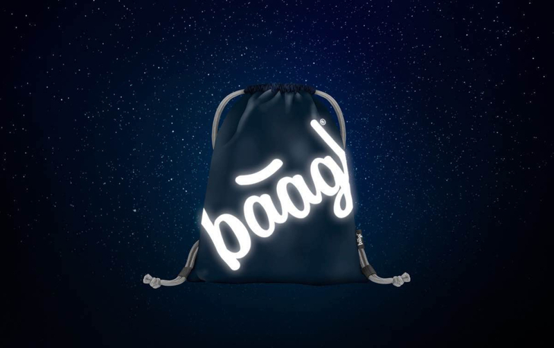 Vrecko na obuv v tmavomodrej farbe s logom Baagl, ktoré v tme svieti, zaťahovanie pomocou pevných šnúrok, ktoré zároveň umožňujú aj nosenie vrecka na chrbte.