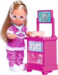 Bábika Evička ako veterinárka s okuliarmi, 3 šteniatkami a vyšetrovacím stolíkom.