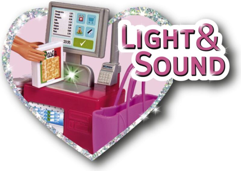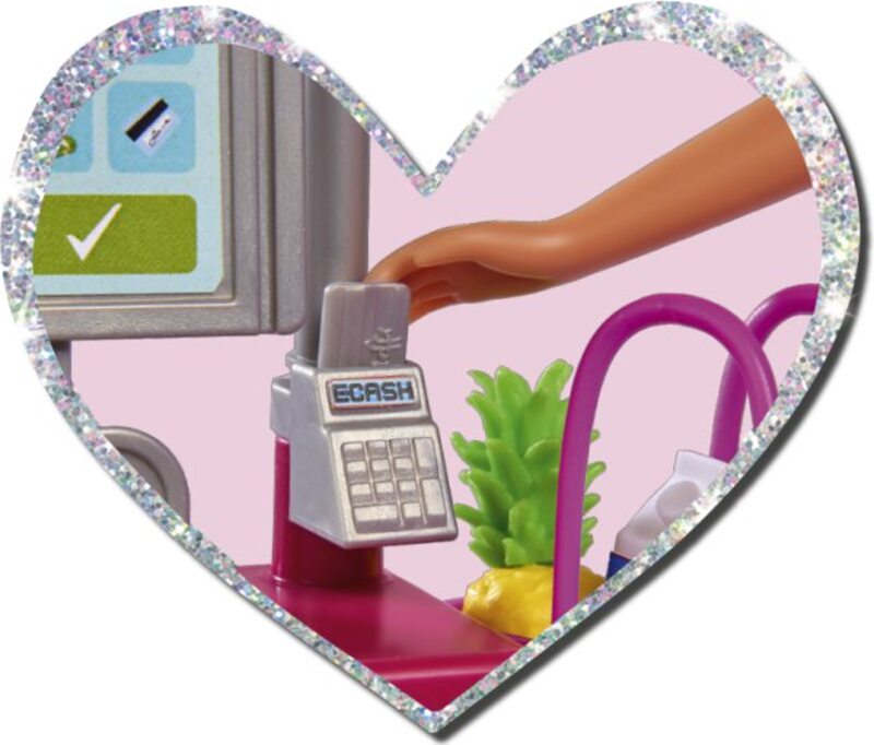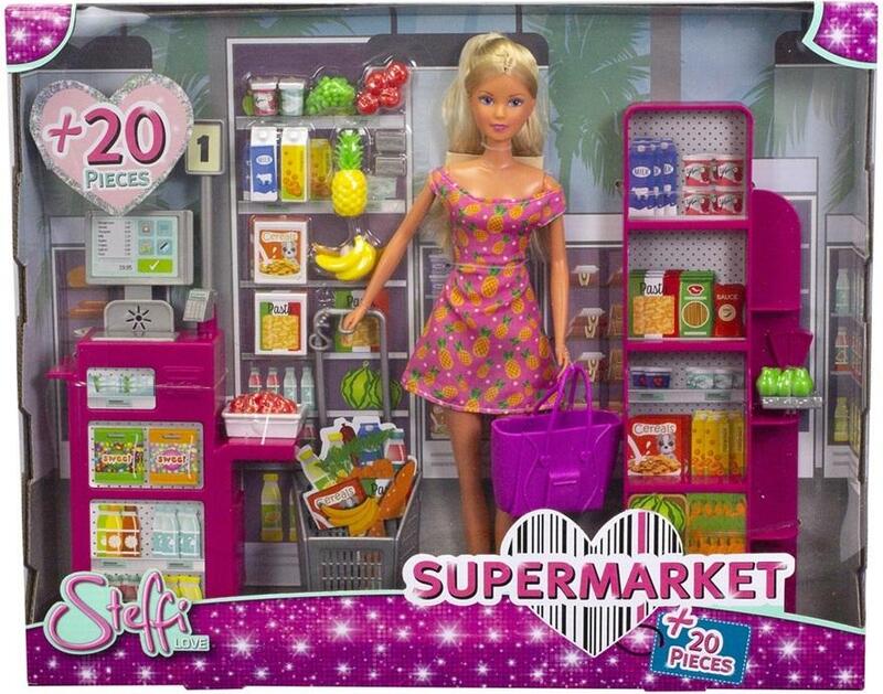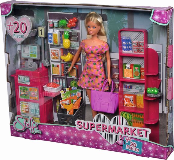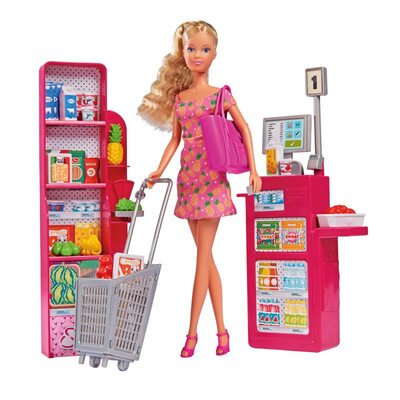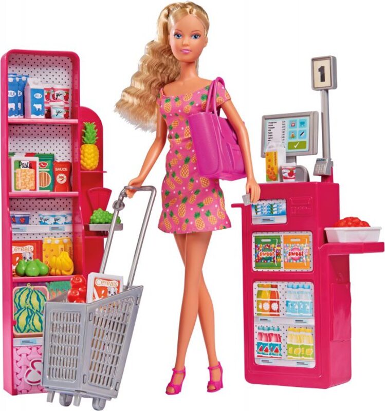 Bábika Steffi v supermarkete s pokladňou, nákupnou taškou a množstvom potravín.