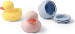 Sada obsahuje tri starostlivo vyrobené kačičky v jemných pastelových farbách. Sú mäkké, príjemné na dotyk a vyrobené z bezpečného silikónu bez BPA a ftalátov.