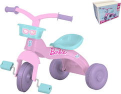 Dievčenská trojkolka Barbie s plastovým rámom, dvojpolohovým sedadlom, predným košíkom a pedálmi.