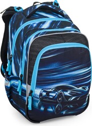 Držte si klobúky, vyrážame! Sada so športovým autom pre malých školákov od 1. do 3. triedy. Batoh je mimoriadne ľahký, ale priestranný. Má tri veľké priehradky. Stojí na plastových nohách, reflexné prvky svietia v tme. Chrbtový systém s nastaviteľným hrudným pásom a ľahkým odnímateľným bedrovým pásom má zdravotný certifikát.