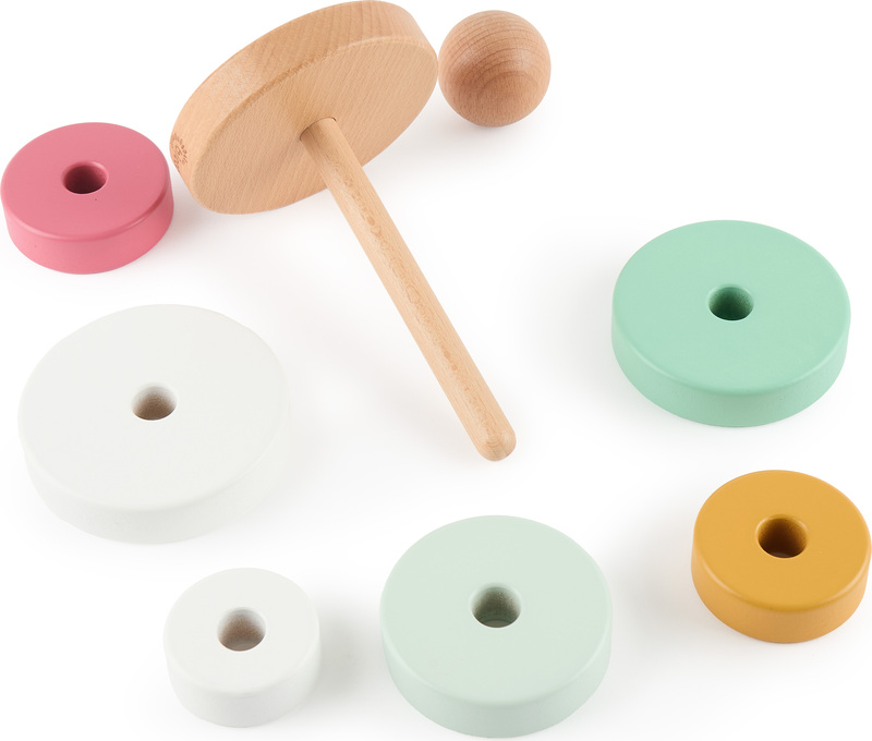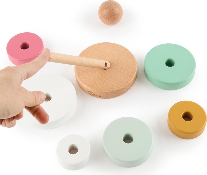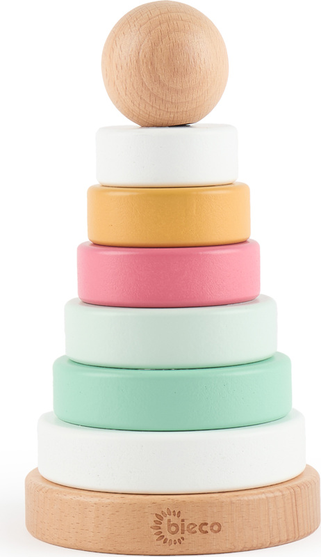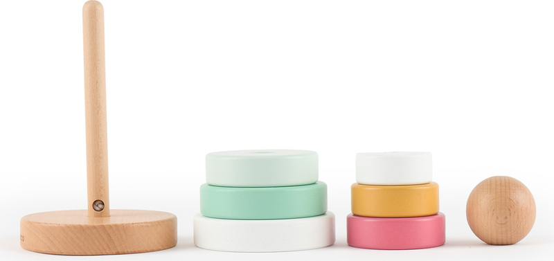 Perfektná hračka pre tréning jemnej motoriky, koordinácia rúk a očí aj rozpoznávanie farieb. Dieliky sú prispôsobené pre malé detské ručičky, vďaka tomu si deti ľahko poradia s ich manipuláciou. Skladacia pyramída kombinuje detský design, jemné farby a kvalitné drevo a je vhodná pre deti od 12 mesiacov. 6 dielikov je možné triediť podľa veľkosti a navliekať na drevenú tyč. Tá je pevne spojená so základňou, možno ju však sklopiť, čo zaisťuje bezpečnú hru