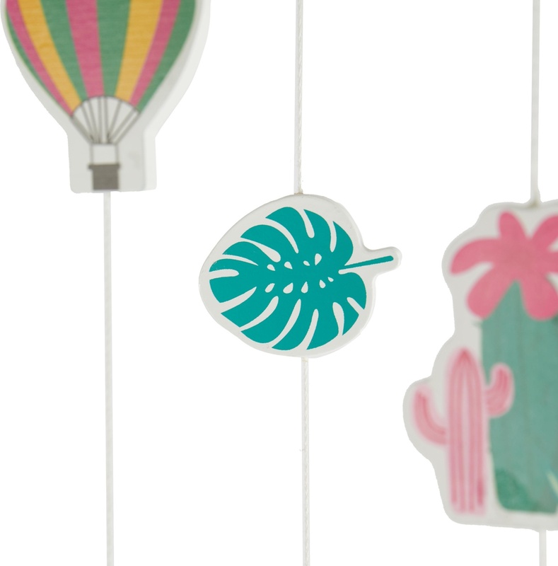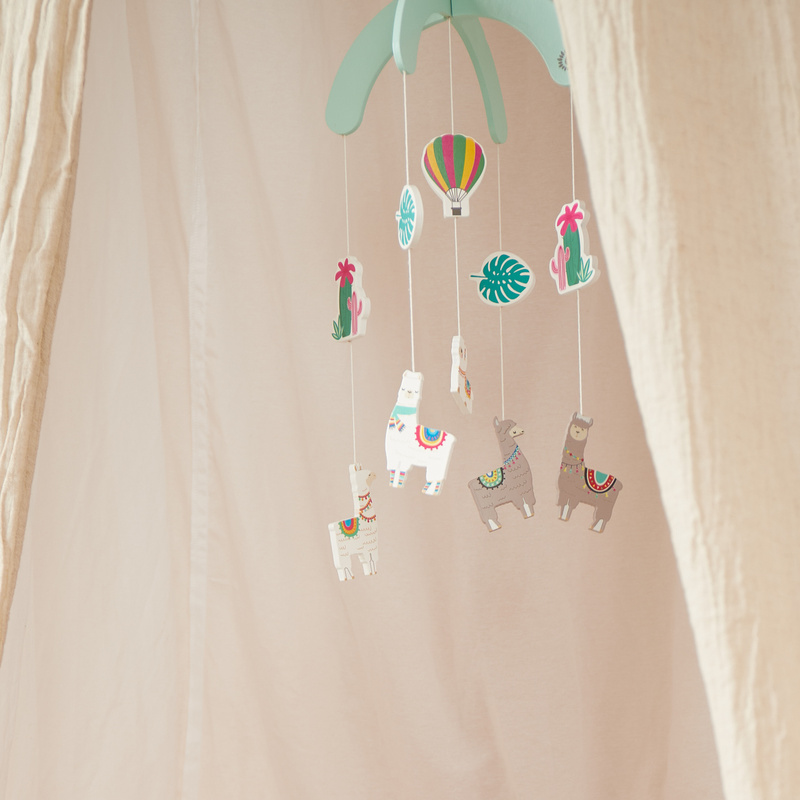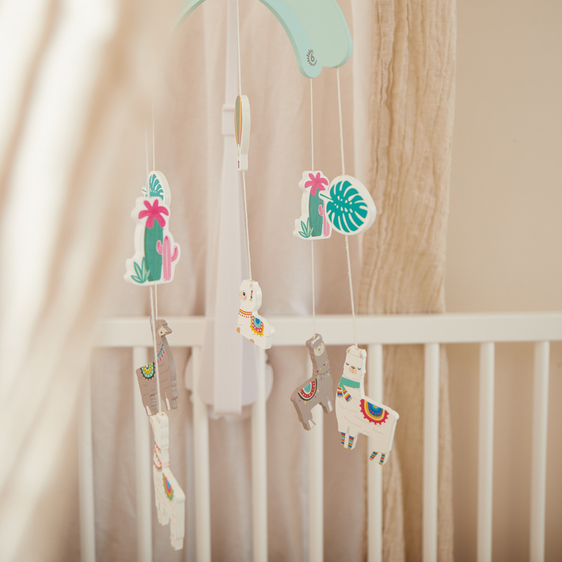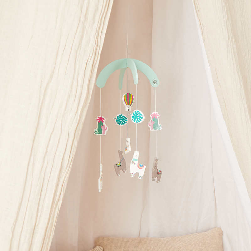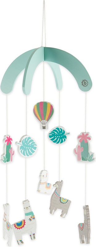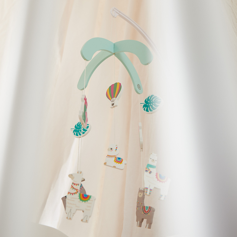Závesný mobil upúta nad postieľkou záujem detí a zároveň ich upokojí. Je navrhnutý s motívmi lamy, balóna a kaktusov v krásne zladených farbách, ktoré dodajú každej izbičke kúzelný nádych. Skvelý pomocník pri prebaľovaní, ktorý upúta detskú pozornosť a vytvorí upokojujúce prostredie. Kvalitné drevo a nádherné, jemné farby robia z mobilu skvelý pútač v každej miestnosti.