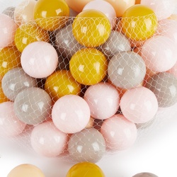 Objavte kúzlo farebných hracích loptičiek. Sada 100 ks hracích loptičiek v krásnych farbách ruže, teplej šedej, béžovej a horčičnej - magická žiara ako východ slnka. Ideálna zábava na záhradu, do hracieho kútika alebo do vane či bazénu. Loptičky využijete na hranie doma aj vonku. Perfektný doplnok pre detskú radosť a rozvoj jemnej motoriky!