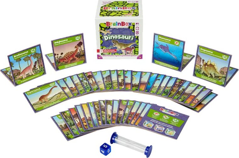 Hra BrainBox Dinosaury obsahuje 55 hracích kariet s ručne maľovanými ilustráciami, ktoré vám doslova oživia každú scénu so suchozemskými, morskými i lietajúcimi dinosaurami.