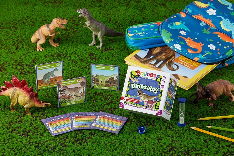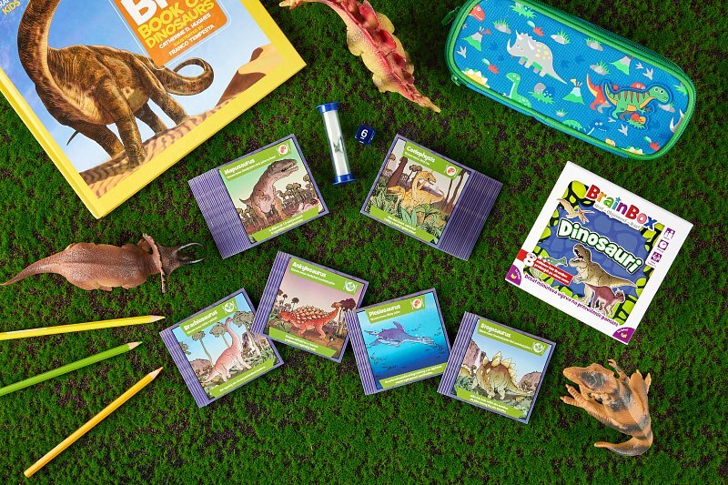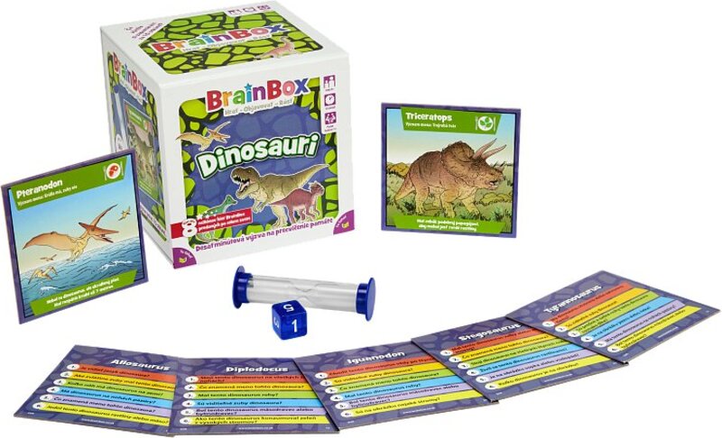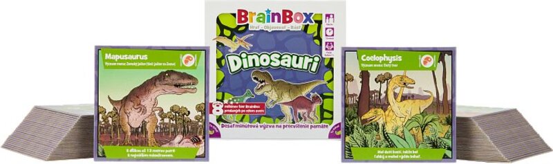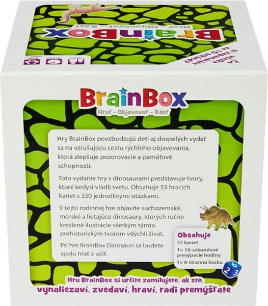 BrainBox je zábavná pamäťová a postrehová kartová hra, ktorá otestuje váš zmysel pre detail. Odpovede na všetky otázky máte priamo pred sebou na karte. Bude vám stačiť 10 sekúnd na to, aby ste si všetko zapamätali? Táto edícia hry, venovaná dinosaurom, vám predstaví tvorov, ktorí kedysi dávno vládli svetu. Aký vysoký bol brachiosaurus? Na čo slúžil zobák triceratopsa? Aký je význam mena vulcanodon?