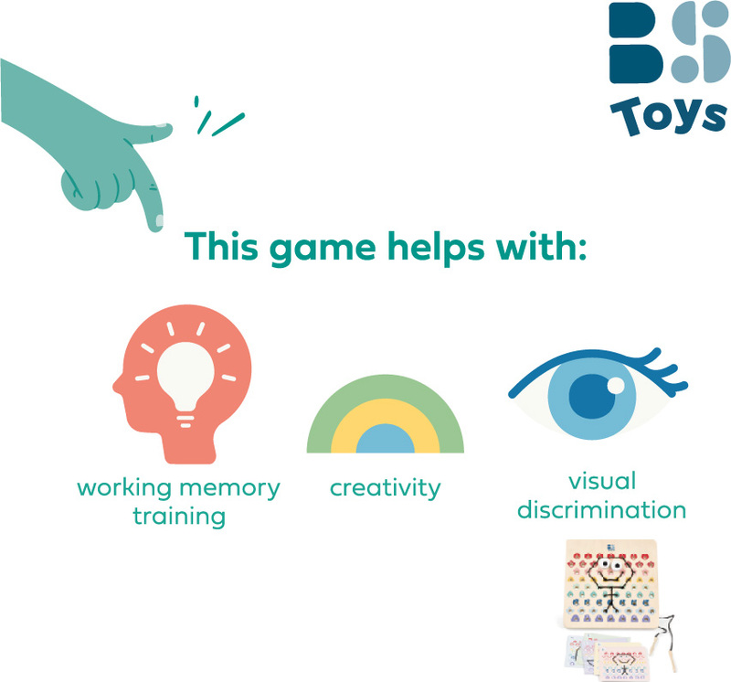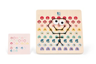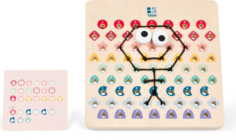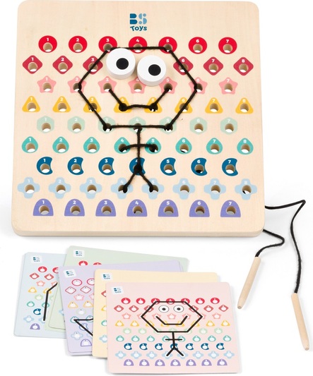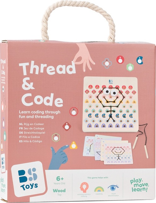 V tejto hre dostanú deti drevenú perforovanú dosku, 2 šnúrky a kartičky s predlohami. Podľa farebných kódov na kartičkách prepletajú deti šnúrky tak, aby vznikli krásne motívy. Začnite jednoduchšími kartičkami a postupujte k tým ťažším. Akonáhle dokončíte kód, otočte kartu a skontrolujte, či výtvor na doske zodpovedá vzoru. Určené pre deti od 6 rokov.