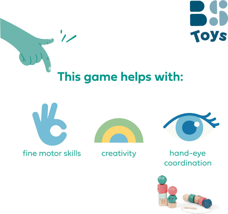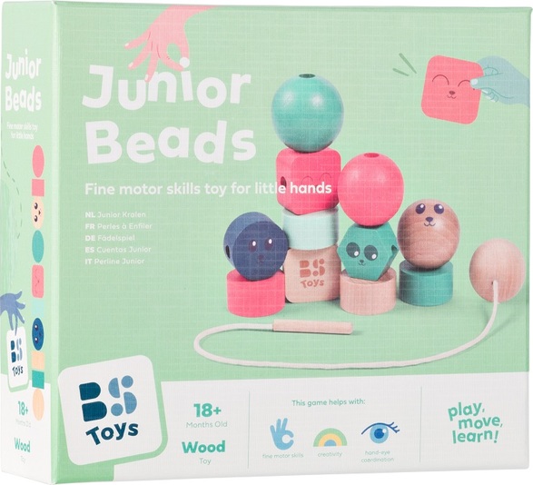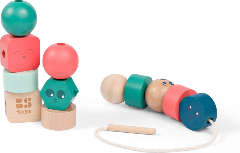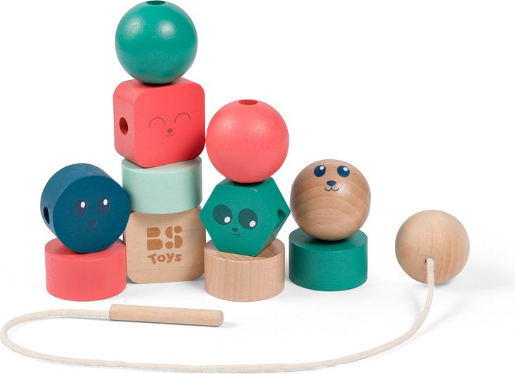 Sada rôznofarebných drevených korálikov pre deti od 18 mesiacov. Prezliekanie farebných korálikov je skvelý spôsob, ako precvičiť koordináciu ruka-oko a jemnú motoriku. Korálky a kocky sú extra veľké a ľahko sa s nimi malým deťom manipuluje.