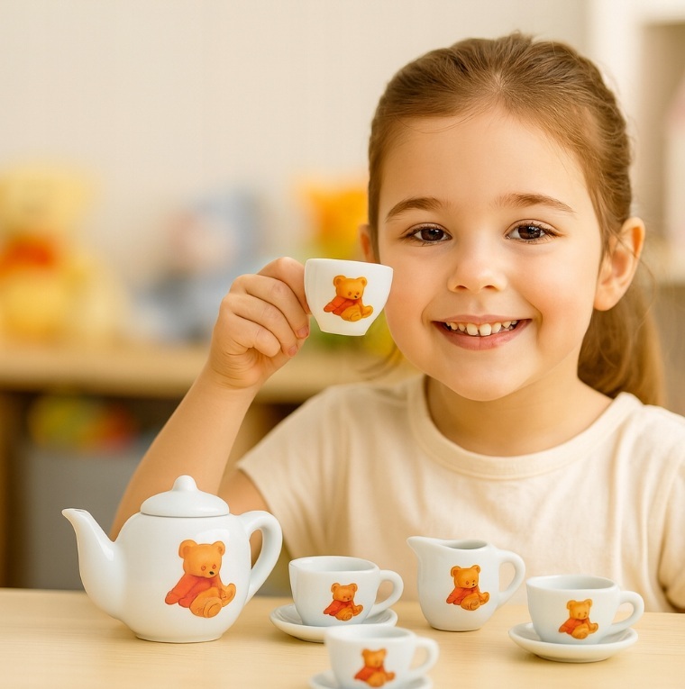 Tento nádherný miniatúrny čajový set, vyrobený z porcelánu a zdobený roztomilým motívom medvedíkov, splní sen každej malej hostiteľke.