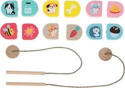 • Sada ponúka 12 drevených navliekacích prvkov, ktoré tvorí 6 párov a dve šnúrky s dreveným kolíkom na prestrkovanie na jednej strane a zarážkou na druhej strane.