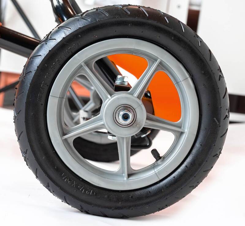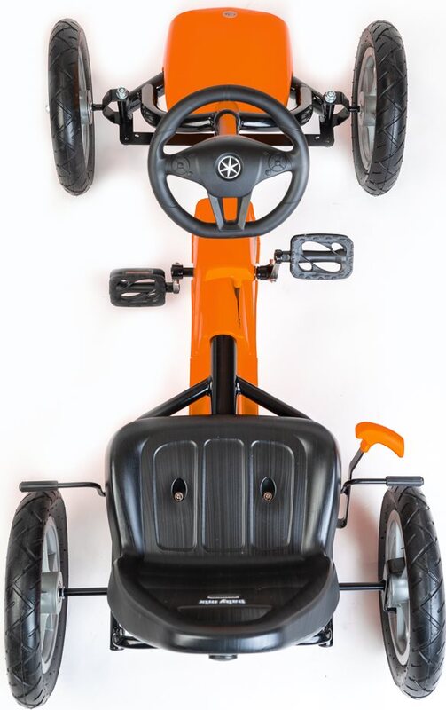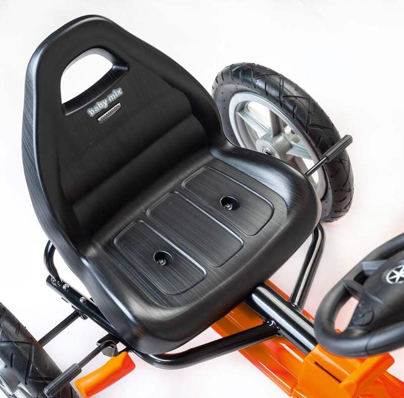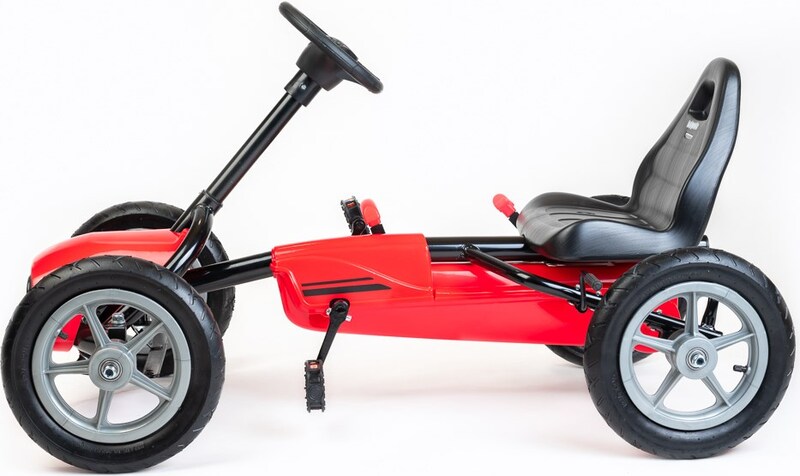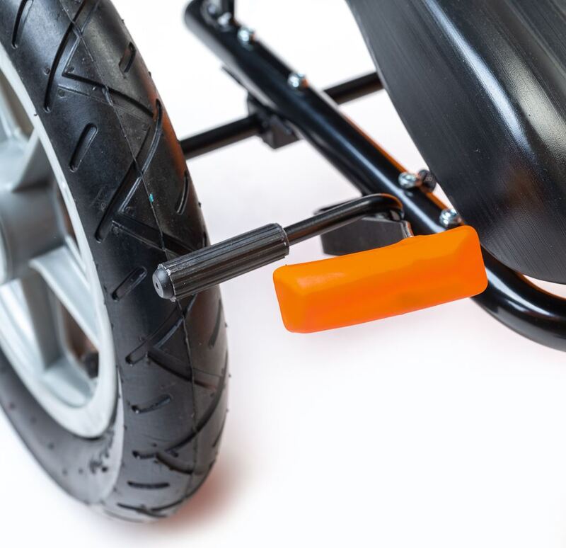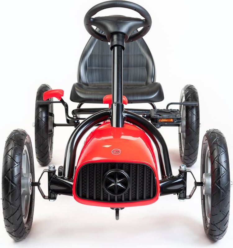 Veľké nafukovacie pneumatiky zaistia komfort a pohodlie pri jazde na akomkoľvek povrchu. Motokára má zabudovaný reťazový pohon s možnosťou odpojenia pohonu - funkcia voľnobežky a ručnú brzdu na zadnej náprave.