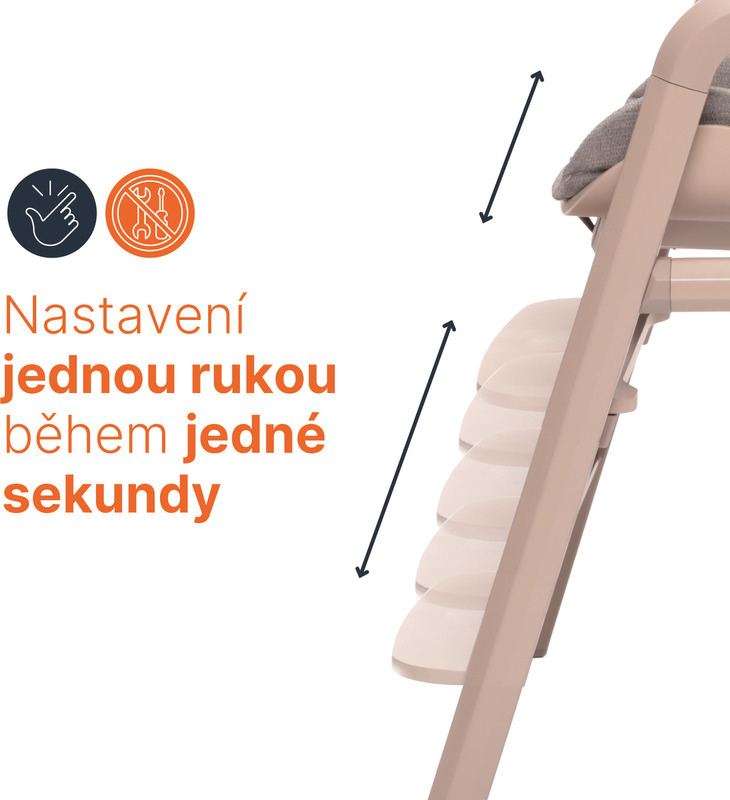 Päťbodový bezpečnostný pás a stabilná konštrukcia zaručia maximálnu ochranu pri každom kŕmení. Hrazda medzi nožičkami zabráni skĺznutiu a zároveň drží odnímateľný pultík s praktickým táckom. -