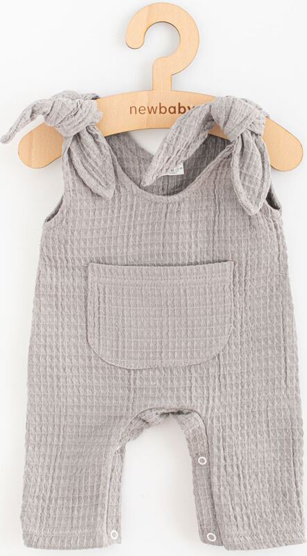 Štýlové a praktické mušelínové detské zahradníčky New Baby Comfort clothes s moderným dizajnom. Zahradníčky ušité z príjemného hrubšieho mušelínu oceníte ako na bežné nosenie, tak aj na rôzne príležitosti, vďaka veľmi zaujímavej štruktúre materiálu. Na prednej strane majú hlboké vrecko a dostatočne široké nohavice, zabezpečia pohodlie bábätka. Zapínanie na cvočky medzi nožičkami a obyčajné zaväzovanie na ramienkach. Týmto spôsobom si môžete korigovať výšku nohavíc.