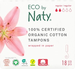 Tampóny sa skladajú kompletne z organickej bavlny. Ich povrch navyše pokrýva bezpečnostný pláštik, vďaka ktorému sa vlákna z tampónu neuvoľňujú, a drží celý valček bavlny lepšie pohromade. Iste vás poteší aj individuálne papierové balenie, ktoré nahrádza predtým využívaný plastový obal. Tampóny Eco by Naty sa teraz ľahšie kompostujú a ich používanie je ešte príjemnejšie. Hygienické tampóny Eco by Naty nesú certifikáciu udelenú medzinárodnou nezávislou organizáciou GOTS (The Global Organic Textile Standard), ktorá potvrdzuje použitie organickej bavlny v produktoch.