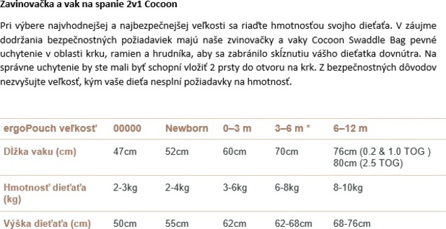 Vak Cocoon Swaddle je vyrobený a vyplnený organickou bavlnou s certifikátom GOTS, s elastanom vo vonkajšej tkanine a bambusom v podšívke. To znamená, že je dostatočne pevný, aby obmedzil úľakový reflex, a zároveň umožňuje rozťahovanie a pohyb pre zdravý rast. Roztiahnutosť umožňuje väčšie pohodlie a dieťatku umožňuje pohybovať rukami do polohy, v ktorej sa samo usadí vo vnútri zavinovačky. Mäkká, priedušná organická bavlna a bambus sú certifikované ako netoxické, farbené farbivami na báze vody a šetrné k pokožke novorodencov a pokožke so sklonom k výskytu ekzémov. Zips chráni aj jemnú pokožku vášho dieťaťa a praktické cvočky na ramená umožňujú premeniť Cocoon zo zavinovačky s rukami na spací vak s rukami, keď dieťa vykazuje známky prevracania. Zvonovitý tvar je schválený Medzinárodným inštitútom pre dyspláziu bedrového kĺbu ako zdravý pre bedrá a podporuje správny vývoj bedrových a ramenných kĺbov. Obojsmerný zips umožňuje rýchlu a jednoduchú výmenu plienky počas spánku s minimálnym narušením.