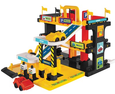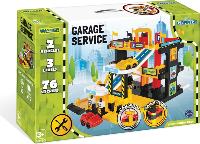 - sada obsahuje: výťah prepravujúci autá na akúkoľvek úroveň, rampu, umývanie auta, výdaj paliva, autoservis, početné dekorácie, 2 autá a nálepky