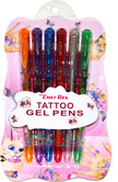 Gélová perá, ktorými je možné kresliť na kožu. Obrázky ľahko odstránite pomocou vlažnej vody a mydla. Pri tetovaní nepoužívajte nadmernej sily, aby nedošlo k poraneniu hrotom pera. Nevkladajte do úst, do očí, pod. Nie je hračka-určené pre výtvarné a umelecké účely.Balenie obsahuje: