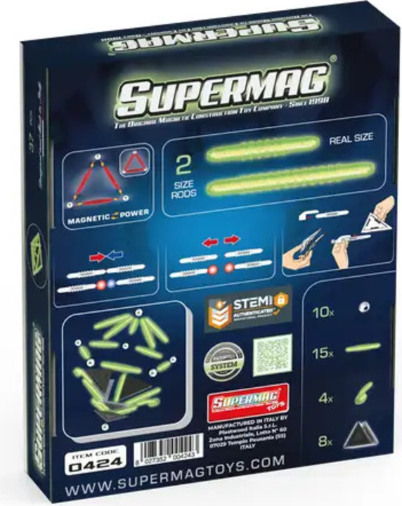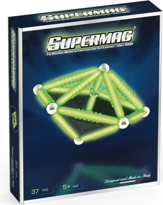 Séria Supermag Glow prináša všetky vzdelávacie a konštrukčné princípy klasickej magnetickej stavebnice a dopĺňa ich o špeciálny fluorescenčný efekt – dieliky svietia v tme a robia tvorenie ešte zábavnejším.