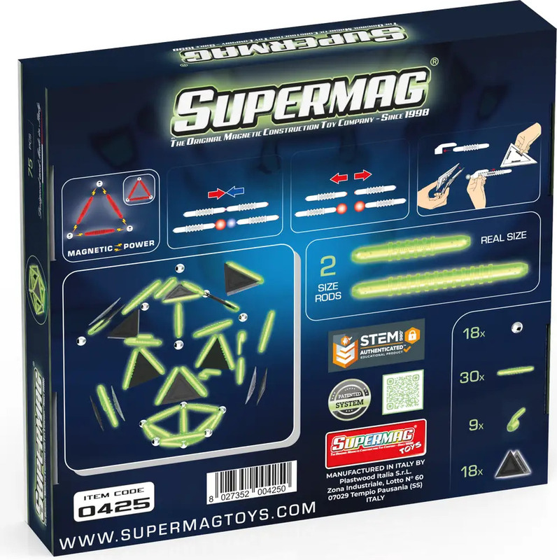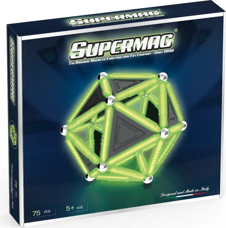 Séria Supermag Glow preberá všetky vzdelávacie a konštrukčné princípy magnetickej stavebnice a pridáva k nim špeciálny fluorescenčný prvok – dieliky svietia v tme a rozširujú možnosti tvorby.