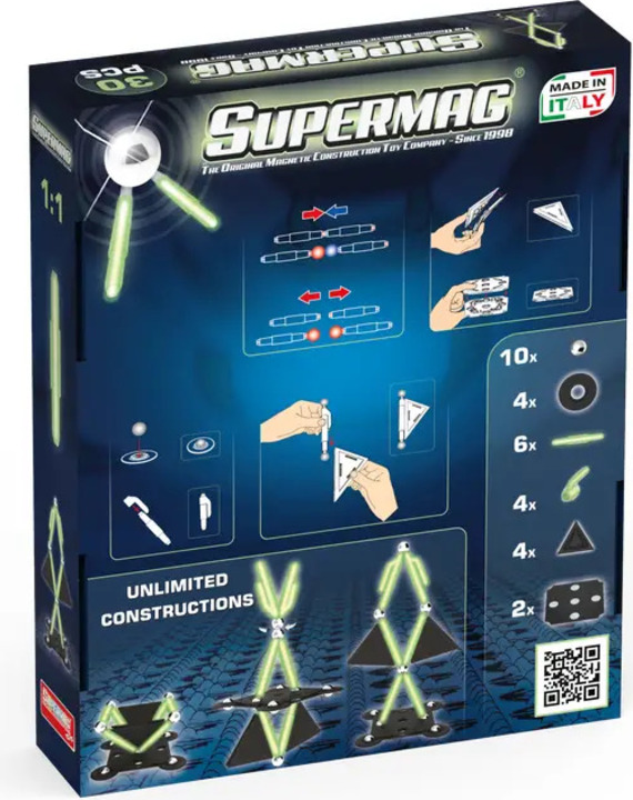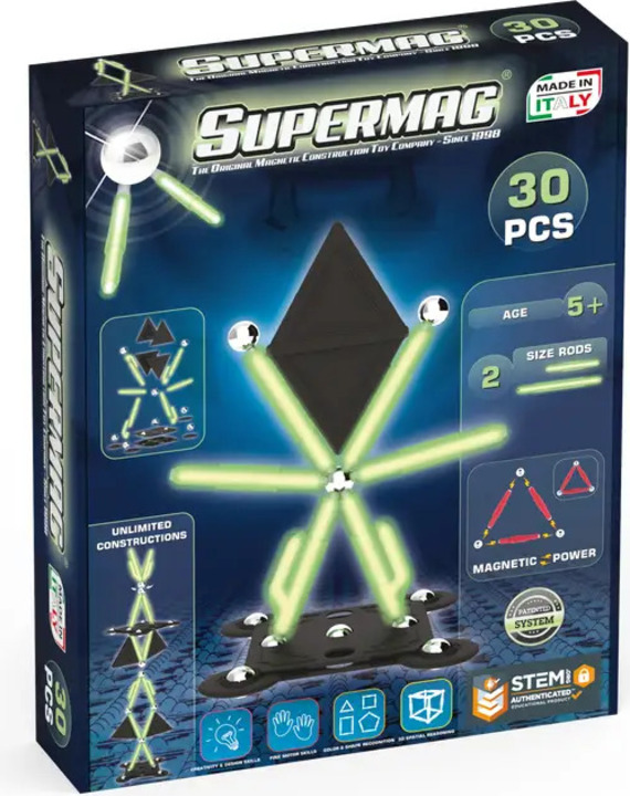 Supermag Phosphorescent je magnetická stavebnica s 30 dielmi, vhodná pre deti od 5 rokov. Obsahuje magnetické tyčinky, oceľové guličky a plastové komponenty, z ktorých možno vytvoriť nekonečné množstvo konštrukcií – jediným limitom je fantázia.