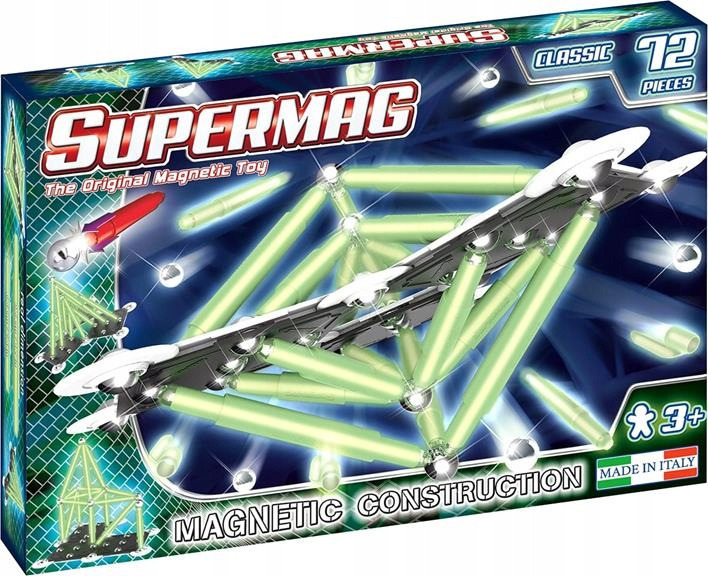 Magnetické kocky Supermag Classic Glow 72 obsahujú 72 dielikov, ktoré po „nabudení“ svetlom svietia v tme. Stavebnica je vhodná pre tvorivé stavby pomocou magnetických tyčiniek, spojov a guličiek, čím podporuje kreativitu a jemnú motoriku.