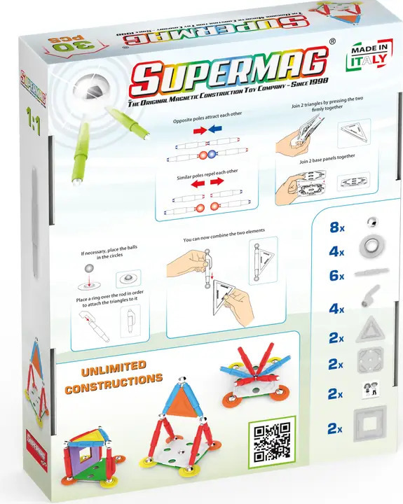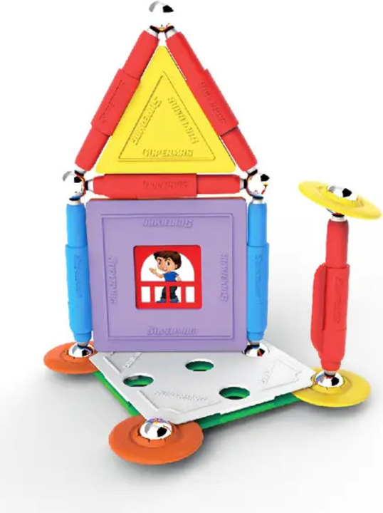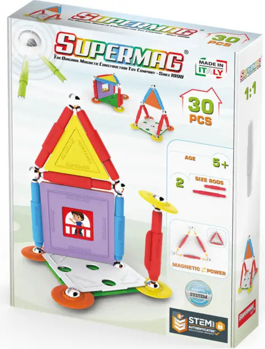 Supermag House je magnetická stavebnica so 30 dielmi, vhodná pre deti od 5 rokov. Obsahuje magnetické tyčinky, oceľové guličky a plastové komponenty, z ktorých možno vytvárať nespočetné množstvo stavieb – jediným limitom je fantázia.