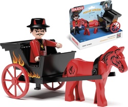 Figúrka Igráčka Čerta Hynka s ohnivým kočiarom ťahaným koníkom Uhlíkom.Inovatívne prepojenie fyzickej hračky s podcastovou rozprávkou Pekelné záprahy.