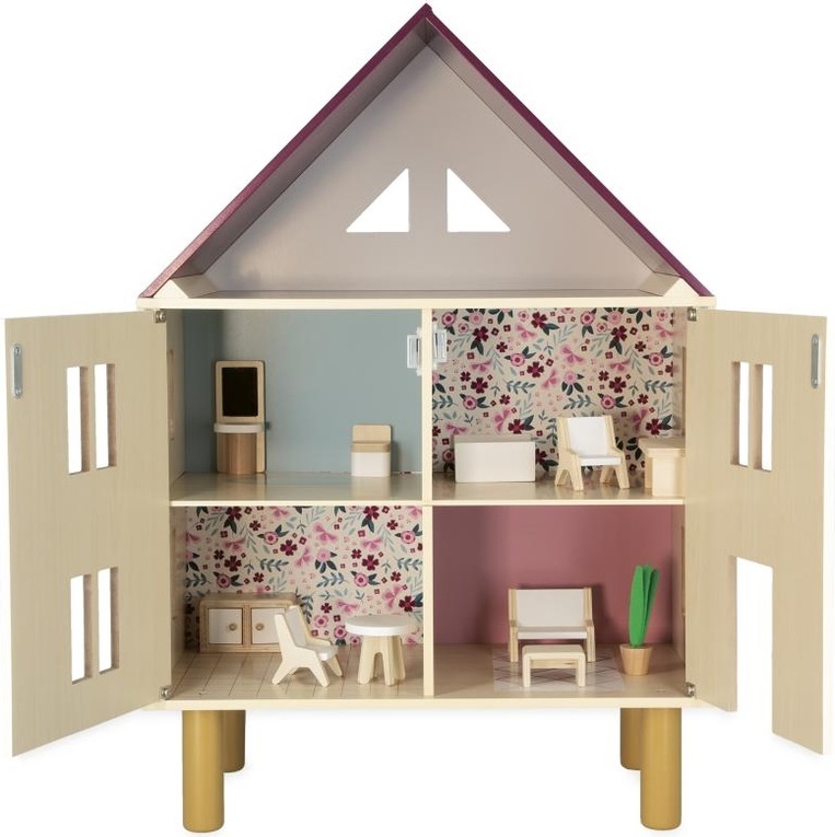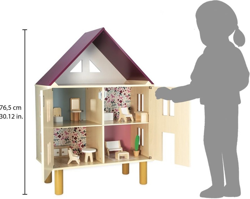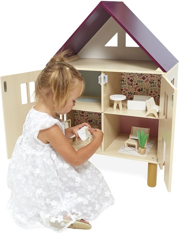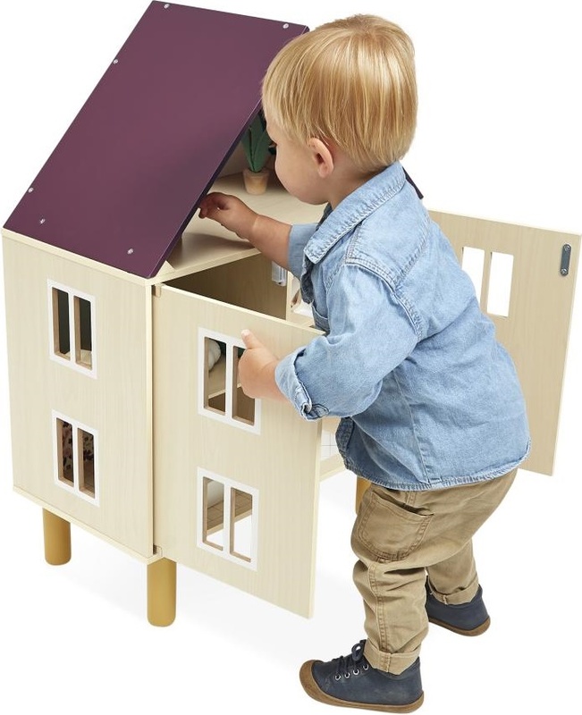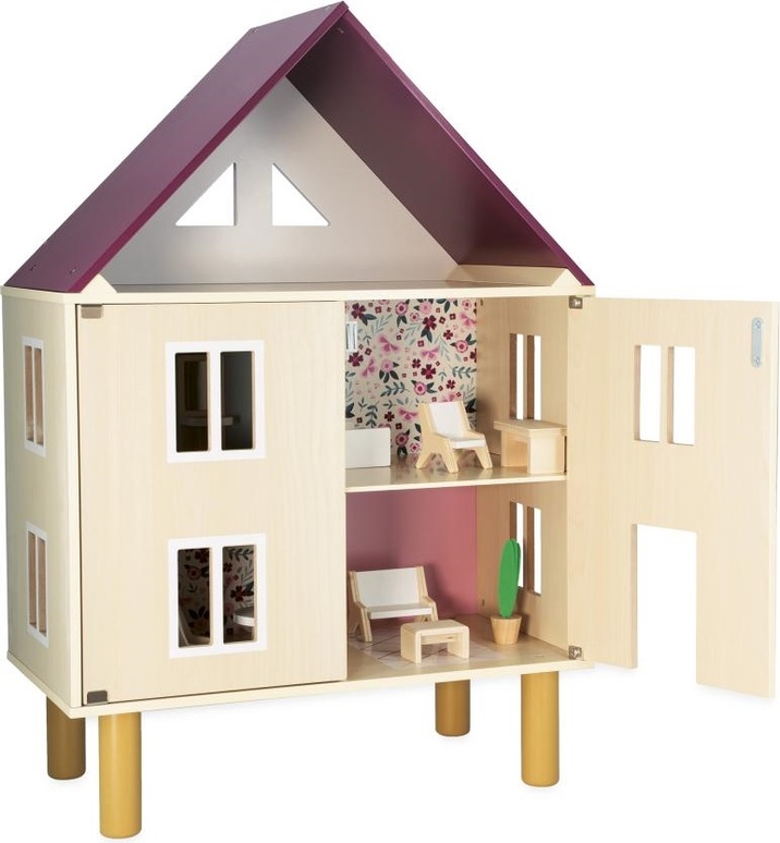 - Domček má magnetické dvere, ktoré sa doširoka otvárajú na hranie a potom sa zatvárajú, aby sa všetko vo vnútri uložilo pre ľahkú prepravu.