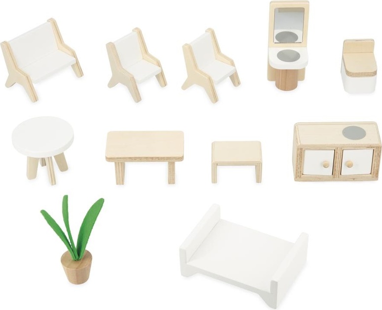 - Má všetko pohodlie, ktoré potrebujete vďaka 11 prvkom, ktoré sa dajú usporiadať tak, ako sa bude vášmu dieťaťu páčiť: 1 veľký stôl, 1 okrúhly stôl, 2 stoličky, 1 pohovka, 1 malý stolík, 1 posteľ, 1 skriňa, 1 umývadlo so zrkadlom, základné WC, a nezabudnime ani na zelenú rastlinu!