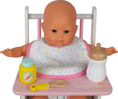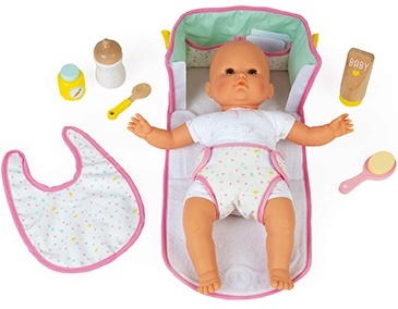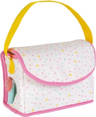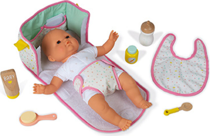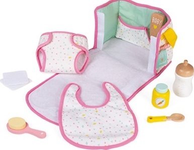 - Pekná látková taška na plienky, ktorá obsahuje všetko, čo vaše dieťa potrebuje, aby sa mohlo starať o svoju bábiku: 1 podbradník, 1 plienka, 1 lyžica, 1 kefa, 1 malá miska, 1 tuba krému, 1 fľaša a 2 bavlnené plienky.