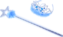 Exkluzívna sada pre zimné princezny! Táto štýlová súprava striebornej farby obsahuje oslnivú korunku s modrými kamienkami a žezlo. Všetko je dekorované ozdobným perím modrej farby. Odchytenie svoj kostým zimné princeznej o tieto nádherné doplnky!