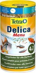 Vysoko hodnotná zmes vločkových krmív-kompletné krmivo, obohatené lyofilisovanými hovädzími pečeňami, nitenkami a komárími larvami v štyroch nádobách.