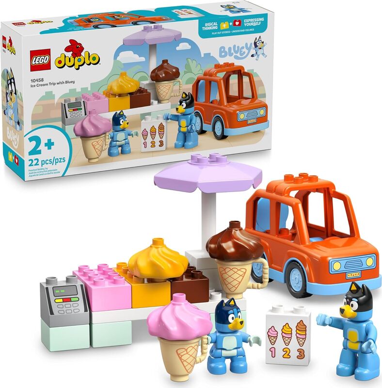 Doprajte deťom zábavné a pohlcujúce hry na postavy so stavebnicou Bluey a výlet na zmrzlinu (10458). Malé deti si s týmto modelom autíčka LEGO® DUPLO® užijú tvorivé dobrodružstvá a zahrajú sa na scény z televíznej šou Bluey.