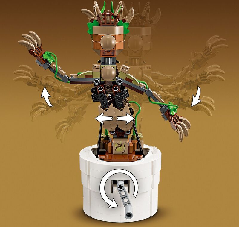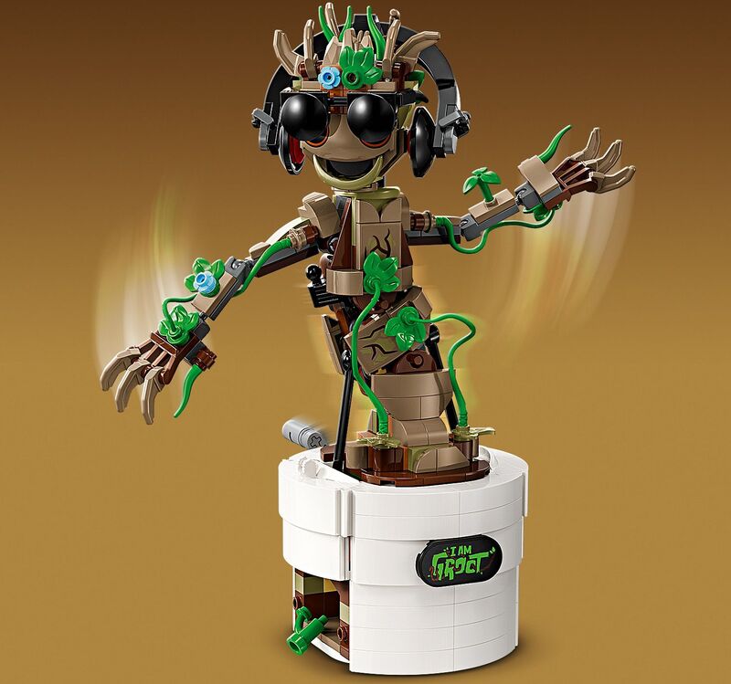 Model Grootapre deti má pohyblivú hlavu aj ruky. Keď deti otočia držiakom na zadnej časti kvetináča, pohyblivý Groot začne tancovať. Figúrku je možné prispôsobiť pomocou ďalších listov, zostaviteľných slúchadiel a slnečných okuliarov a deti si môžu prispôsobiť Gro otov kvetináč pridaním 1 z 3 rôznych ceduliek na prednej strane (vrátane jednej súvisiacej s televíznym programom Ja som Groot). Všetky doplnky je možné uložiť do vstavanej priehradky kvetináča. Aby bolo stavanie modelu ešte zábavnejšie, aplikáciaLEGO Builder umožňuje deťom približovať, otáčať modely v 3D a sledovať svoj pokrok počas stavania.