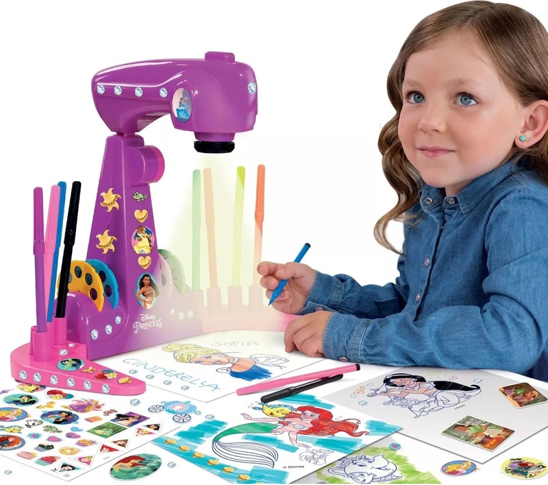 Lisciani projektor šablón s obrázkami Disney princezien na kreslenie.Balenie obsahuje projektor, 4 disky so šablónami (32 obrázkov), 36 dekoračných kamienkov, 76 samolepiek, 8x farebnú fixku.