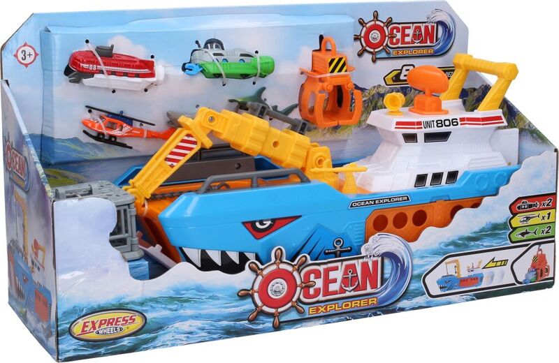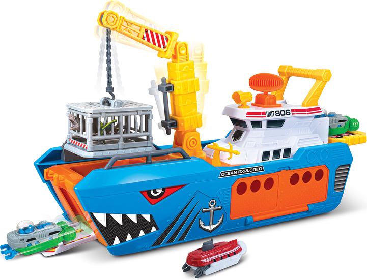 Herná súprava Loď so žeriavom a žralokmi obsahuje loď so žeriavom a klietkou na žraloky, 2 žraloky, 2 ponorky a vrtuľník.