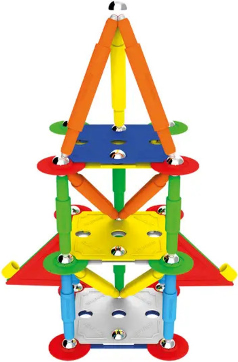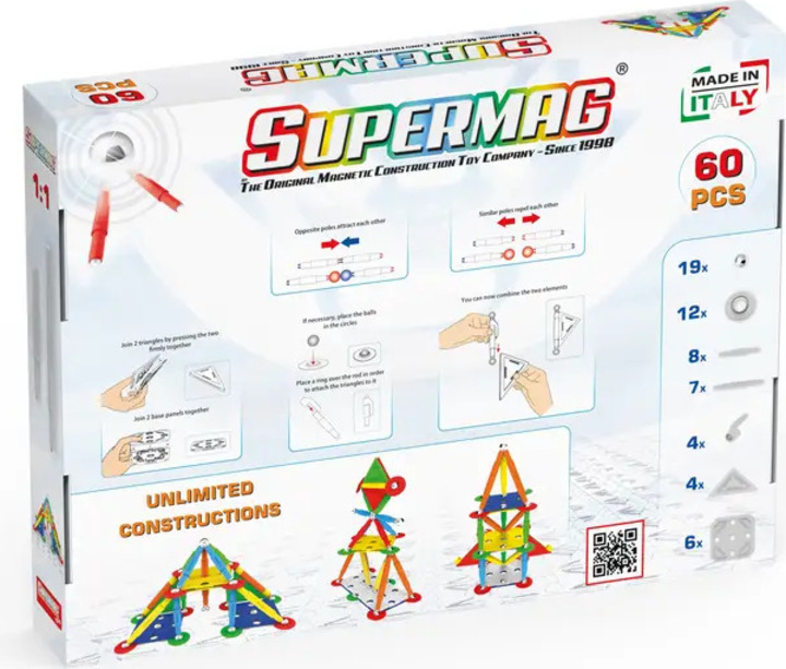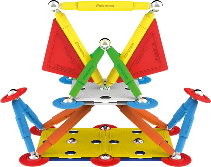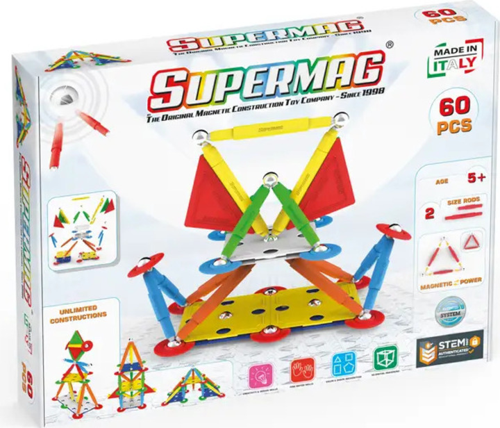 Supermag Multicolor je magnetická stavebnica so 60 dielmi, vhodná pre deti od 5 rokov. Obsahuje magnetické tyčinky, oceľové guličky a plastové komponenty, z ktorých sa dajú vytvárať nespočetné konštrukcie – jediným limitom je fantázia.