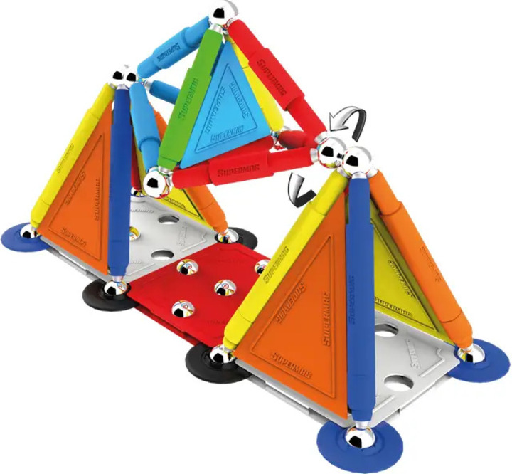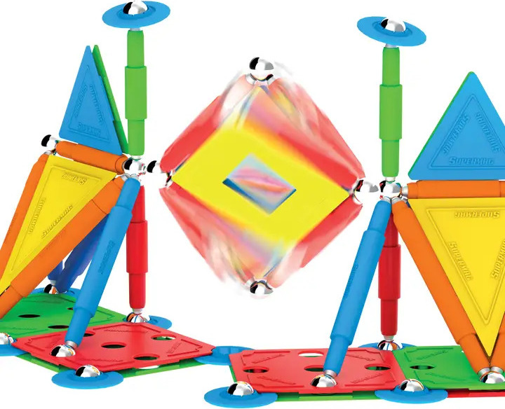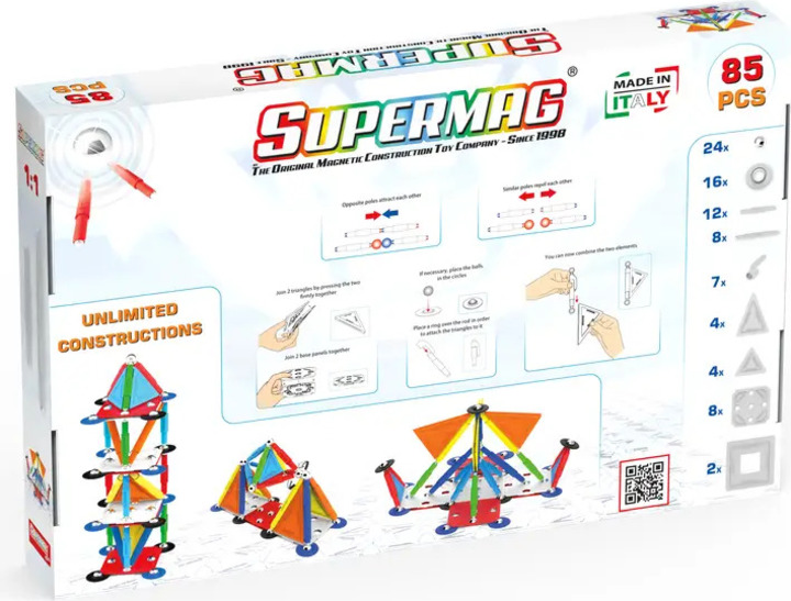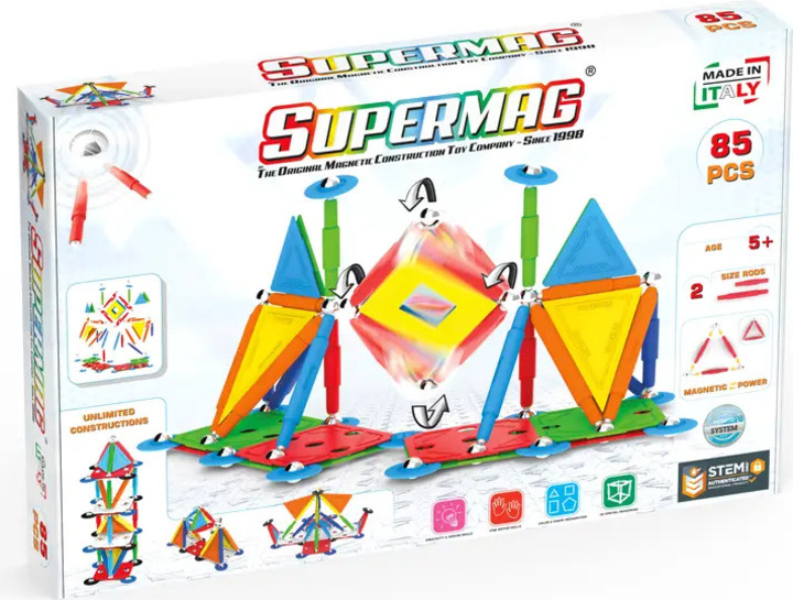 Supermag Multicolor je magnetická stavebnica s 85 dielmi, vhodná pre deti od 5 rokov. Obsahuje magnetické tyčinky, oceľové guličky a plastové komponenty, z ktorých sa dajú vytvárať nekonečné konštrukcie – jediným limitom je fantázia.
