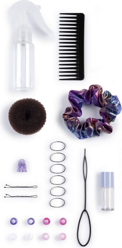 Hnedé, nylonové vlasy sú odolné a mäkké, takže ich môžete ľubovoľne upravovať, zapletať do vrkočov a vytvárať tak fantazijné účesy! Súčasťou súpravy sú doplnky, ktoré spestria zábavu v kaderníctve. Pomocou hrebeňa dôkladne rozčešte tmavé puky. Vďaka gumičkám a zasúvacím prvkom sa účes udrží na mieste. A pokiaľ ide o zdobenie – použite farebné korálky!