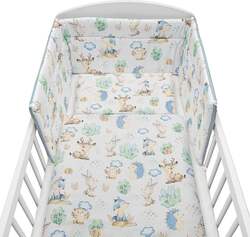 Detská súprava do postieľky New Baby 3-dielna pre bábätká. Súprava je vyrobená z 100% bavlny. Obsahuje obliečky na vankúšik cca 40x60 cm + obliečky na perinku cca 100x135 cm a mantinel cca 31x175 cm. Materiál 100% bavlna. Tieto výrobky sú bezpečné, pretože: - prírodná bavlna nespôsobuje odreniny a podráždenie, pretože neobsahuje formaldehydy a ďalšie prvky, ktoré dojčatám škodí - nestráca farbu a nezfarbuje oblečenie - ponúkané vzory sú príjemné na pohľad a majú upokojujúce farby - zipsy používané u obliečky sú tzv. "bezpečné zipsy" bez voľne visiace koncovky, ktorú by mohlo dieťa odtrhnúť a prehltnúť - nie sú použité žiadne gombíky ani žiadne ďalšie plastové alebo oceľové časti, ktoré môžu byť pre Vaše dieťa nebezpečné - materiál, ktorý je používaný pre výplne vankúšov a prikrývok, je 100% protialergický, čo znamená, že sa v jeho vláknach nešíri žiadne mikroorganizmy ani pleseň.