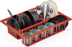 Odkvapkávač so sadou riadu obsahuje tanieriky, príbory, šálky a kuchynský riad.
