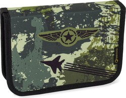 Vojenské puzdro pre malých školákov so stíhačkou a obrázkovým rozvrhom ako darček. Vo vnútri sú dve priehradky s gumenými úchytkami na písacie potreby a priehľadné vrecko na rozvrh.
